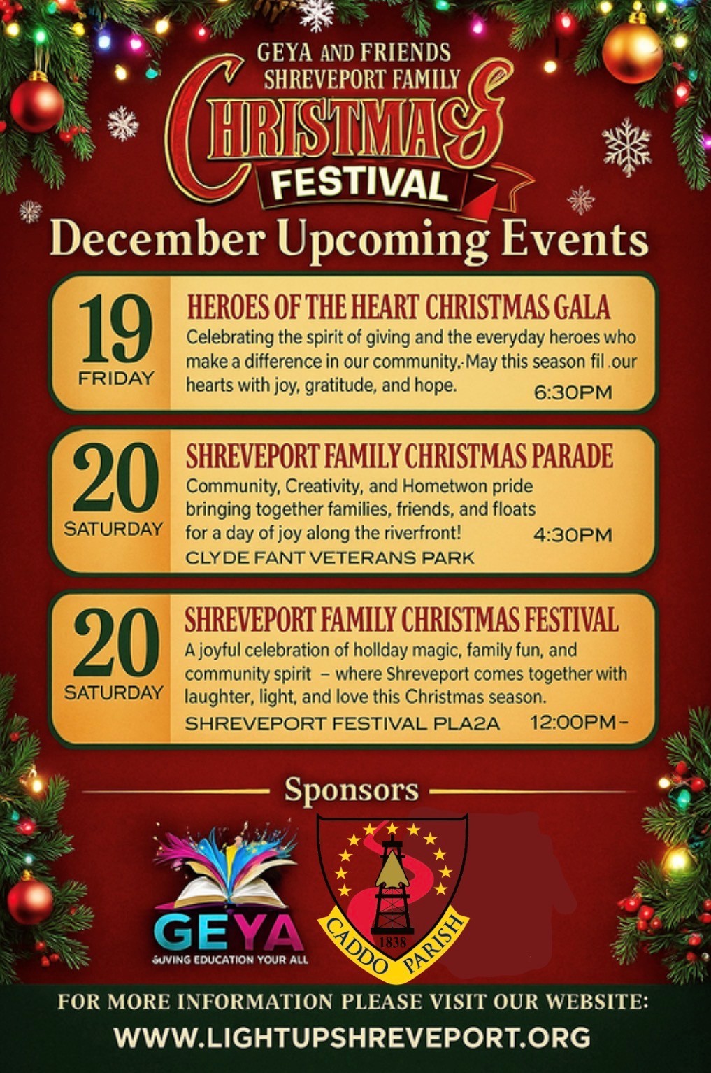 Caddo Parish, in conjunction with Gingerbread House and GEYA (Giving Education Your All), a nonprofit dedicated to bridging the gap between school, home, and community through dynamic programming and meaningful family-centered events on December 20, 2025, 12:00 pm – 4:00 pm, at Festival Plaza, 101 Crockett St., Shreveport.  For nearly decades, this beloved kickoff to the holiday season had drawn thousands of families to downtown Shreveport for a day filled with joy, unity, cultural celebration, and cherished tradition.