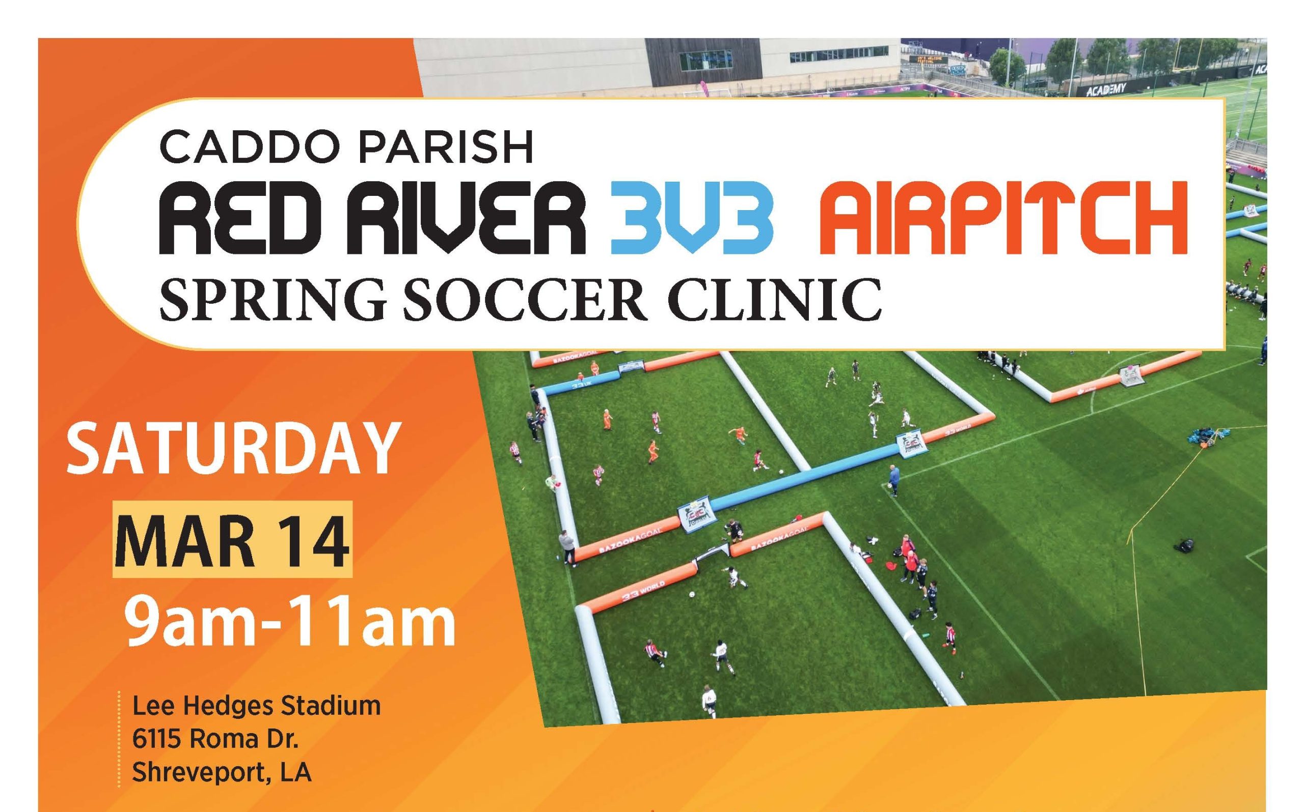 Caddo Parish Parks and Recreation in conjunction with Shreveport Strikers are excited to present a dynamic 3V3 soccer clinic, the Red River 3V3 AIRPITCH SPRING Soccer Clinic, on Saturday, March 14, 2026, 9 am – 11 am, at Lee Hedges Stadium, it is designed to bring more soccer opportunities to our community. This fast-paced, high-energy format offers a super fun and engaging way for young players of all skill levels to get involved in the game with more dribbles, more passes, more intensity & more Fun!