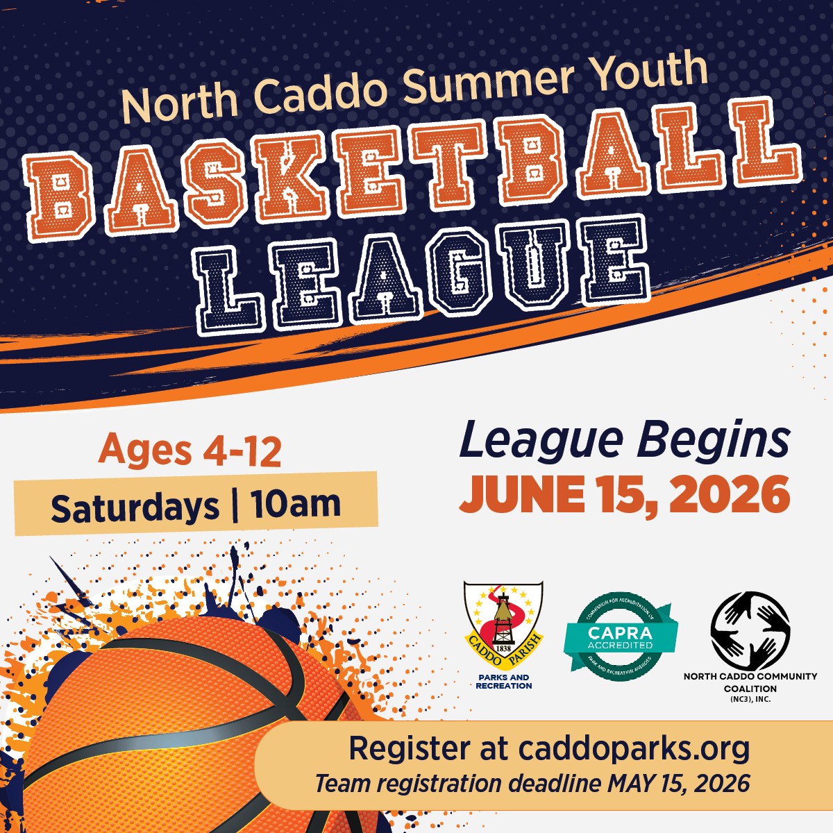 Caddo Parish Parks and Recreation, in partnership with North Caddo Community Coalition (NC3), will offer a youth summer basketball league for boys and girls ages 4-12. This program is designed to promote youth engagement, physical fitness, mentorship, and community pride in the North Caddo region. Participants will enjoy a safe, structured, and supportive environment that helps build confidence both on and off the court.