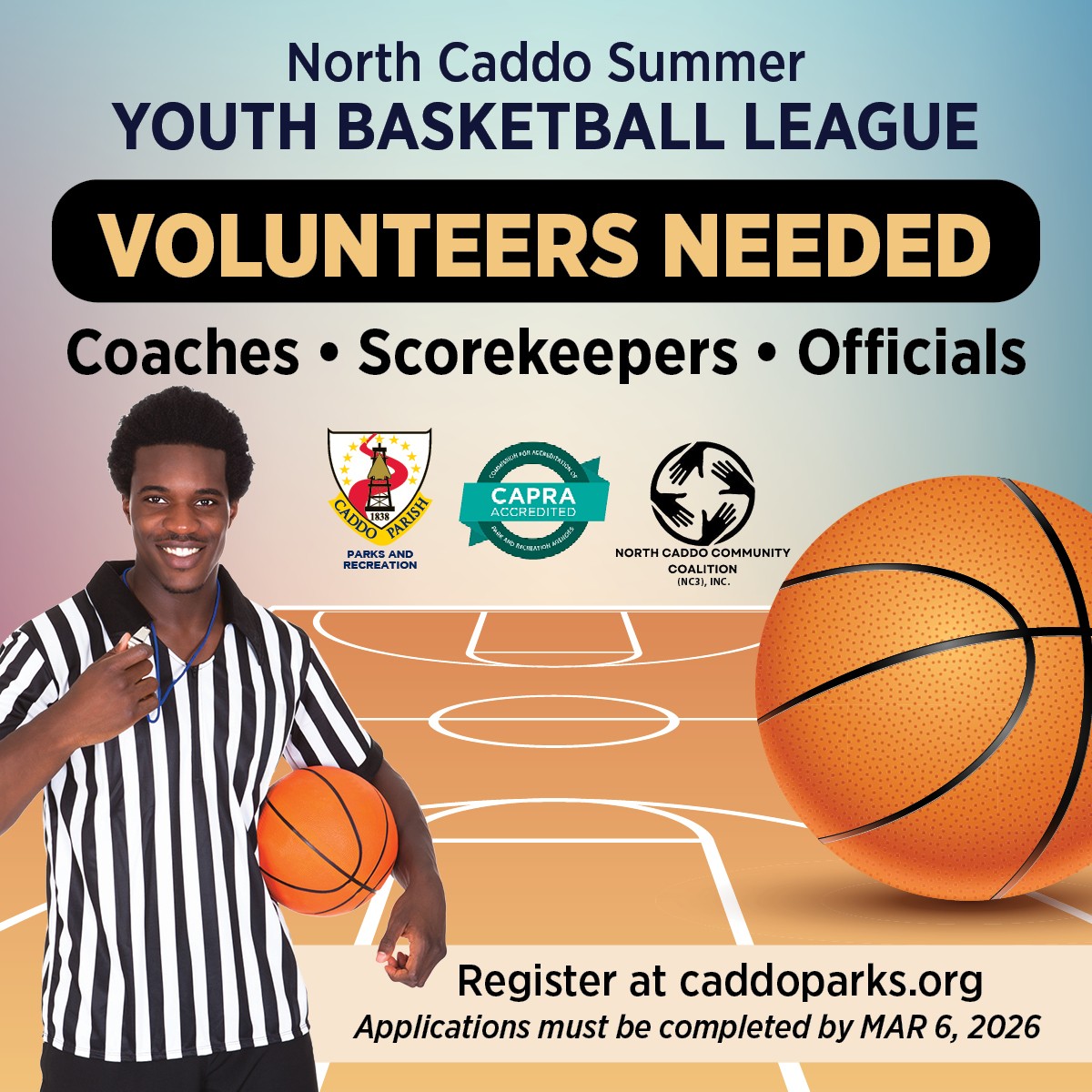 Caddo Parish and North Caddo Community Coalition (NC3) are seeking volunteer Coaches, Scorekeepers, and Officials for the North Caddo Summer Youth Basketball League.  All volunteers are required to complete the following: Complete Volunteer Application (which includes a background check) - forms.caddoparks.org Youth Sports Coach Application - forms.caddoparks.org The application must be completed by March 6, 2026. For additional information contact ...