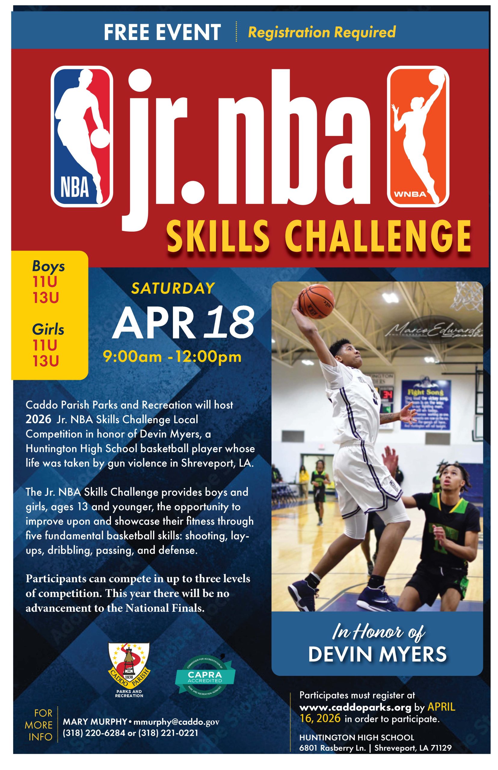 PROGRAM: Caddo Parish Friends of Devin Meyers, Jr. NBA Basketball Challenge DATE/TIME: One-day event, April 18, 2026 / 9:00 am – 12:00 pm. WHERE: Huntington High School, Shreveport, LA Registration Deadline: April 15, 2026, online or onsite Caddo Parish Parks and Recreation, in conjunction with Caddo Parish Schools, Jr. NBA, and Raising Cane, will sponsor a one-day general skills and ...