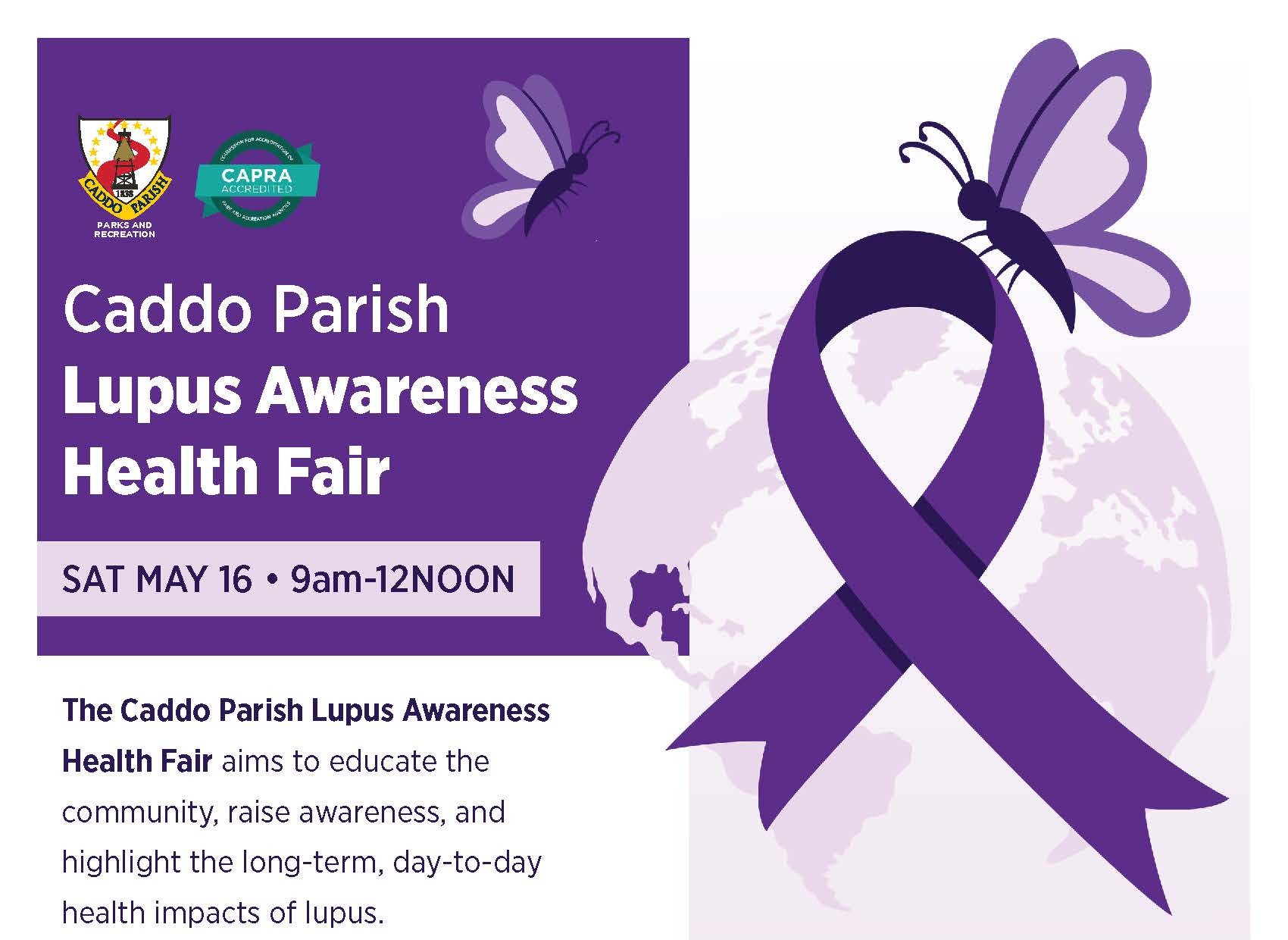 The Caddo Parish Lupus Awareness Health Fair on May 16, 2026, 9 am - 12 pm aims to educate the community, raise awareness, and highlight the long-term, day-to-day health impacts of lupus. Health professionals will serve as guest presenters, and on-site wellness screenings will be available. Light fitness activities will be offered. Please dress comfortably and wear purple. A ...