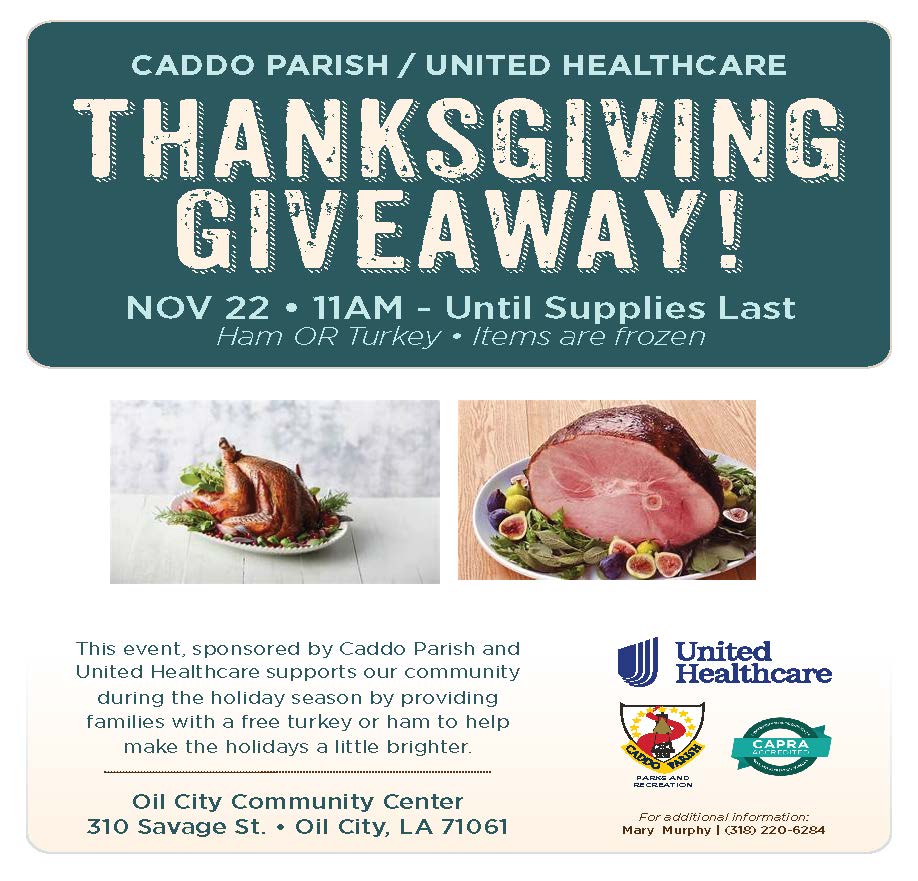 November 20, 2025Caddo Parish Parks and Recreation, in partnership with UnitedHealthcare, will host a Turkey & Ham Giveaway on November 22, 2025, beginning at 11:00 am and continuing while supplies last. 📍...