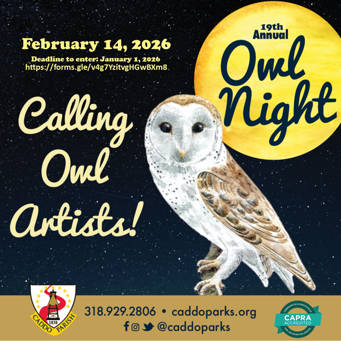 November 18, 2025Call for Artists at Owl Night on February 14, 2026 Owl Night invites visitors to meet live owls and explore their night world! Caddo Parish Parks and Recreation Department announces a call for...
