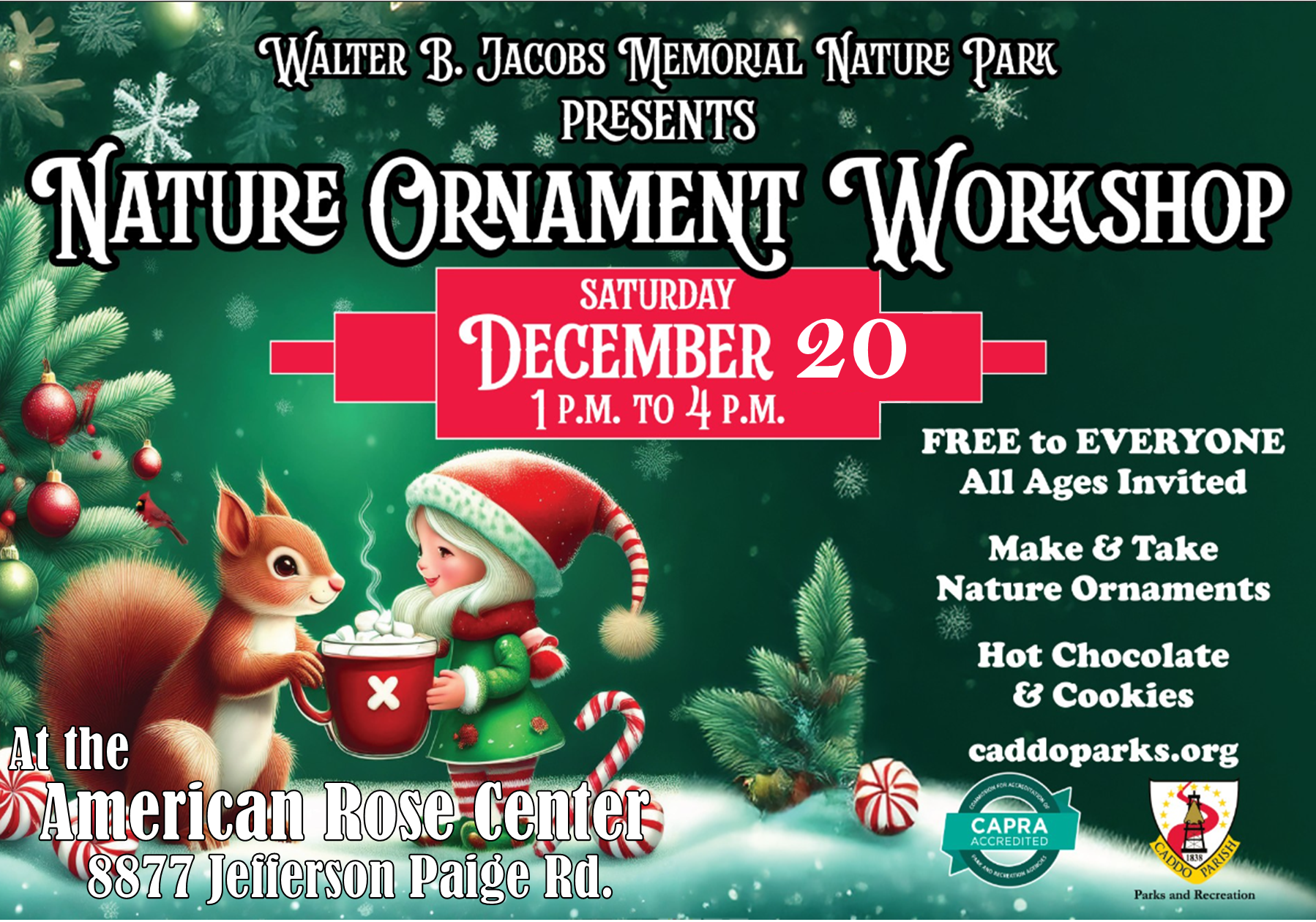 Caddo Parish Parks and Recreation & Walter B. Jacobs Memorial Nature Park are excited to host a festive Nature Ornament Workshop at the American Rose Center as part of the annual Christmas in Roseland celebration. This free, family-friendly event will take place on Sunday, December 20, from 1 PM to 4 PM, and offers a creative, eco-friendly way to celebrate ... |