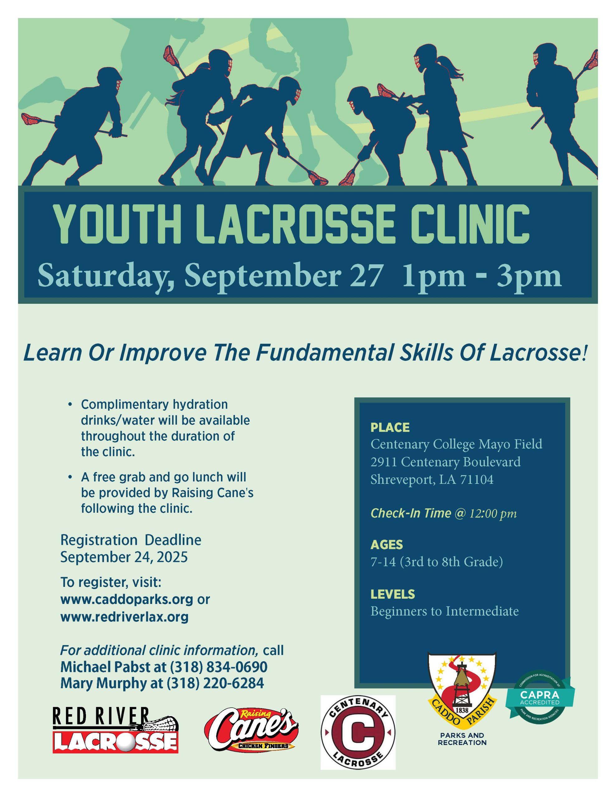 September 12, 2025YOUTH LACROSSE CLINIC Caddo Parish Parks and Recreation, Centenary College Lacrosse & Red River Lacrosse Association are teaming up to offer a Youth Lacrosse Clinic on Saturday, September 27,...
